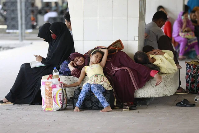 ট্রেনের অপেক্ষায় থাকতে থাকতে ক্লান্ত হয়ে ঘুমিয়ে পড়েছেন এক নারী ও শিশু। দুপুর সাড়ে ১২টা, কমলাপুর স্টেশন, ঢাকা, ৪ মেছবি: শুভ্র কান্তি দাশ