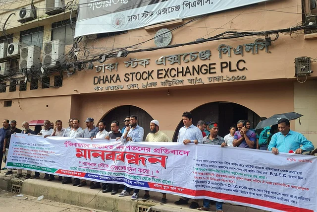 বাংলাদেশ বিনিয়োগকারী ঐক্য পরিষদের ব্যানারে বিক্ষুব্ধ বিনিয়োগকারীরা পূর্বঘোষিত কর্মসূচি অনুযায়ী মানববন্ধন পালন করেন। এ সময় তাঁরা দরপতন ঠেকাতে ব্যর্থতার অভিযোগে পুঁজিবাজার নিয়ন্ত্রক সংস্থা বাংলাদেশ সিকিউরিটিজ অ্যান্ড এক্সচেঞ্জ কমিশনের (বিএসইসি) চেয়ারম্যান খন্দকার রাশেদ মাকসুদের পদত্যাগের দাবিতে স্লোগান দেন।