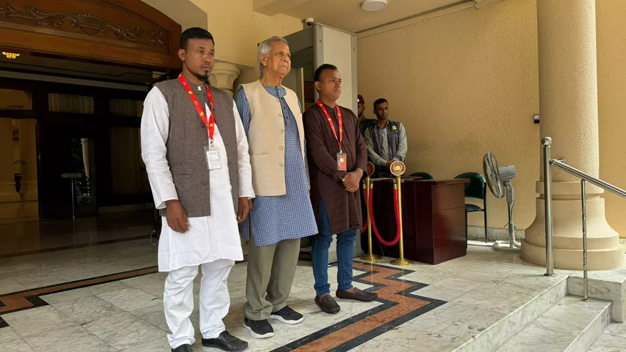 আজ মঞ্চে প্রেসিডেন্সিয়াল গার্ড রেজিমেন্ট (পিজিআর) প্রধান উপদেষ্টাকে গার্ড স্যালুট দেওয়ার সময় দুই ভাইও মঞ্চে উপস্থিত ছিলেন।