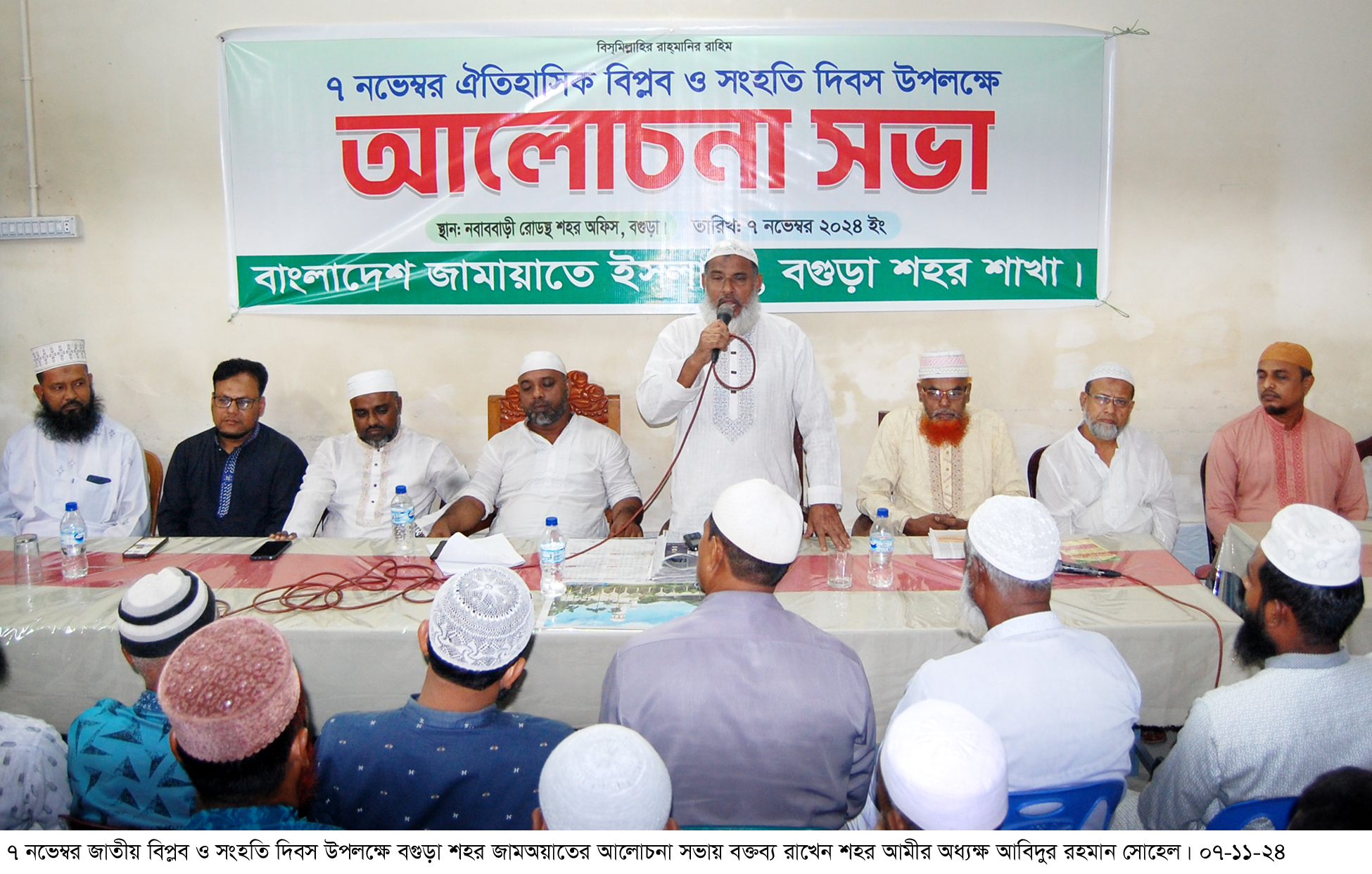 জাতীয় বিপ্লব ও সংহতি দিবস উপলক্ষ্যে জামায়াতে ইসলামী বগুড়া শহর শাখার উদ্যোগে বৃহস্পতিবার বিকেলে শহর কার্যালয়ে আলোচনা সভা অনুষ্ঠিত হয়। শহর আমির অধ্যক্ষ আবিদুর রহমান সোহেলের সভাপতিত্বে আলোচনা সভায় বক্তব্য রাখেন শহর জামায়াতের নায়েবে আমির মাওলানা আব্দুল হালিম বেগ, সেক্রেটারি অধ্যাপক আ.স.ম আব্দুল মালেক, সহকারি সেক্রেটারি অধ্যাপক রফিকুল আলম, অধ্যাপক মোঃ আব্দুস ছালাম তুহিন, আজগর আলী, এ্যাড. শাহীন মিয়া, আব্দুল হামিদ বেগ, হেদাইতুল ইসলাম, ইকবাল হোসেন প্রমূখ। বক্তারা বলেন, ছাত্র-জনতার রক্তের বিনিময়ে শেখ হাসিনা দেশ ছেড়ে পালালেও দেশ এখনো ফ্যাসিবাদ মুক্ত হয়নি। ফ্যাসিবাদের দোসররা এখনো দেশের নানা জায়গায় ঘাপটি মেরে আছে। এই দোসরদের অবিলম্বে গ্রেফতার করে আইনের আওতায় নিতে হবে। বক্তারা আরও বলেন, ১৯৭৫ সালের ৭ই নভেম্বর সেনাবাহিনীর সাথে কাঁধে কাঁধ মিলিয়ে যেভাবে দেশবিরোধী অপশক্তির কবল থেকে দেশকে রক্সা করেছিলেন, আবারও কোন অপ শক্তি দেশের বিরুদ্ধে চক্রান্ত করলে এদেশের দেশপ্রেমিক সেনাবাহিনী এবং বীল জনতা বুকের রক্ত দিয়ে তা রুখে দিবে। জামায়াতে ইসলামী এবং ইসলামী ছাত্রশিবিরের নেতাকর্মিরা দেশের স্বাধীনতা-সার্বভৌমত্ব রক্ষায় জীবনের শেষ রক্তবিন্দু দিয়ে লড়াই করবে। আলোচনা সভা শেষে সকল শহীদদের মাগফিরাত কামনায় বিশেষ দোয়া ও মুনাজাত করা হয়। এদিকে, দিবসটি উপলক্ষ্যে দুপুরে বগুড়া প্রেসক্লাব মিলনায়তনে আলোচনা সভা আয়োজন করে বগুড়া প্রেসক্লাব ও সাংবাদিক ইউনিয়ন বগুড়া। সভায় বক্তব্য রাখেন জেলা বিএনপির সভাপতি রেজাউল করিম বাদশা, ভারপ্রাপ্ত সাধারন সম্পাদক মোশাররফ হোসেন, শহর জামায়াতের আমির অধ্যক্ষ আবিদুর রহমান সোহেল, বগুড়া প্রেসক্লাবের আহ্বায়ক ওয়াসিকুর রহমান বেচান, সদস্য সচিব সবুর শাহ লোটাস, সাংবাদিক ইউনিয়ন বগুড়ার সভাপতি গনেশ দাস, সাধারন সম্পাদক এস এম আবু সাঈদ প্রমূখ। এছাড়া জেলা বিএনপি দিবসটি উপলক্ষ্যে শহরে বিশাল র্যালী বের করে।
