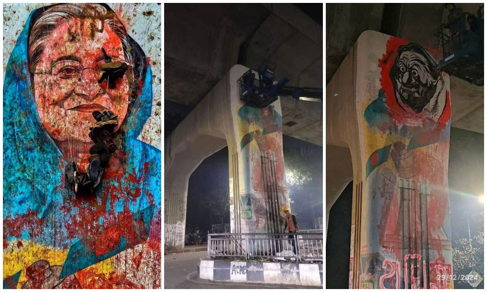 ঢাকা বিশ্ববিদ্যালয়ের (ঢাবি) রাজু ভাস্কর্য সংলগ্ন মেট্রোরেলের পিলারে সাবেক প্রধানমন্ত্রী শেখ হাসিনার ব্যঙ্গ গ্রাফিতি মধ্যরাতে মুছে ফেলার চেষ্টা করেছেন সিটি করপোরেশনের কর্মীরা। পরে বিষয়টি জানতে পেরে শিক্ষার্থীরা এসে বাধা দেন এবং শিক্ষার্থীরা আবারো শেখ হাসিনার ব্যঙ্গ গ্রাফিতি আঁকেন।