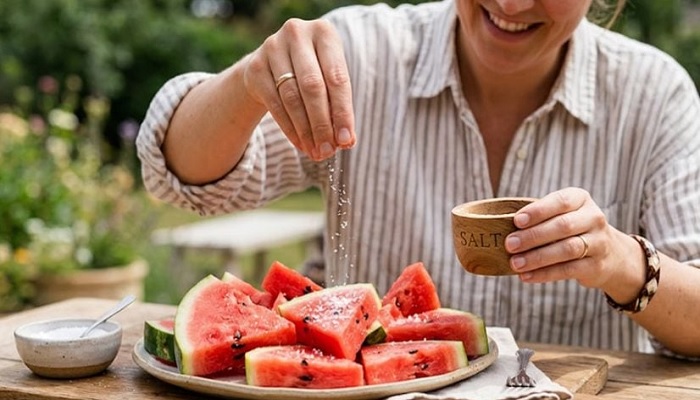 স্বাদের ভারসাম্য উন্নত করতে পারে : কখনও কখনও তরমুজের স্বাদ পানসে বা অতিরিক্ত জলীয় মনে হতে পারে, বিশেষ করে যদি এটি পুরোপুরি পাকা না হয়। এক চিমটি লবণ স্বাদের ভারসাম্য বজায় রাখতে সাহায্য করে, যা প্রতিটি কামড়কে আরও তৃপ্তিদায়ক করে তোলে। এটি সামগ্রিক স্বাদকে আরও তীব্র করে এবং কাঁচা বা কম মিষ্টি ফলের কারণে সৃষ্ট স্বাদহীনতা কমিয়ে দেয়।