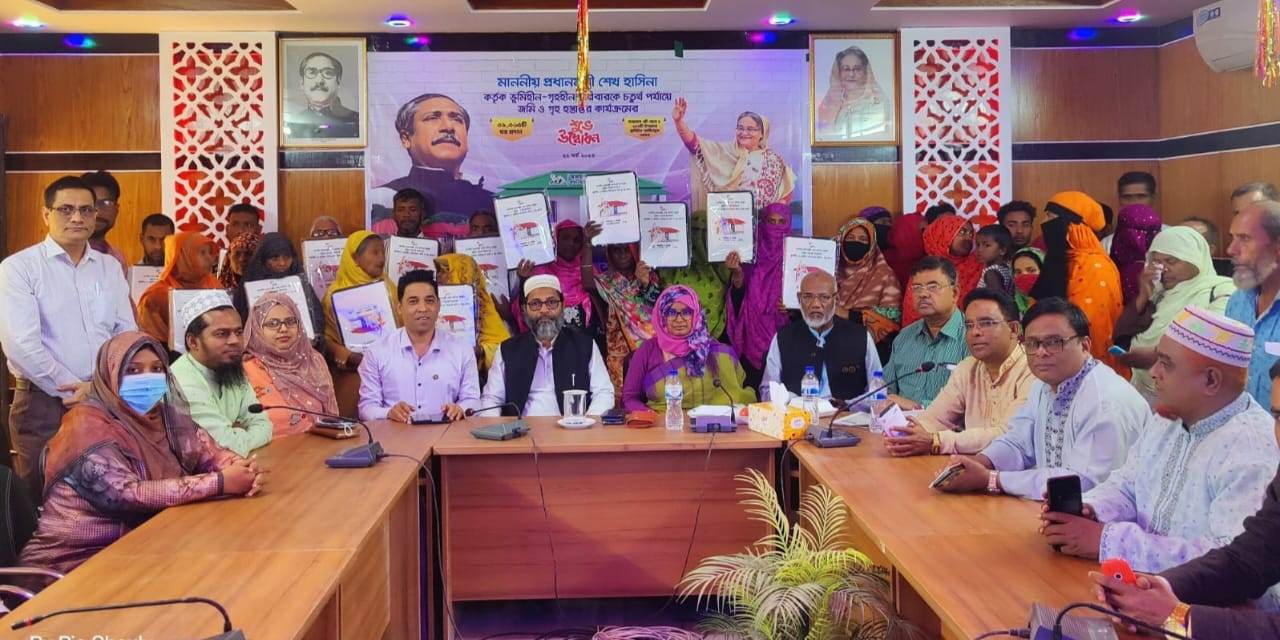 বুধবার গণভবন থেকে ভার্চুয়ালি প্রধানমন্ত্রীর উদ্বোধন শেষে উপজেলা পরিষদের সভাকক্ষে ভূমিহীনদের মাঝে জমির দলিল-নামজারির কাগজপত্রসহ ঘরের চাবি তুলে দেওয়া হয়।