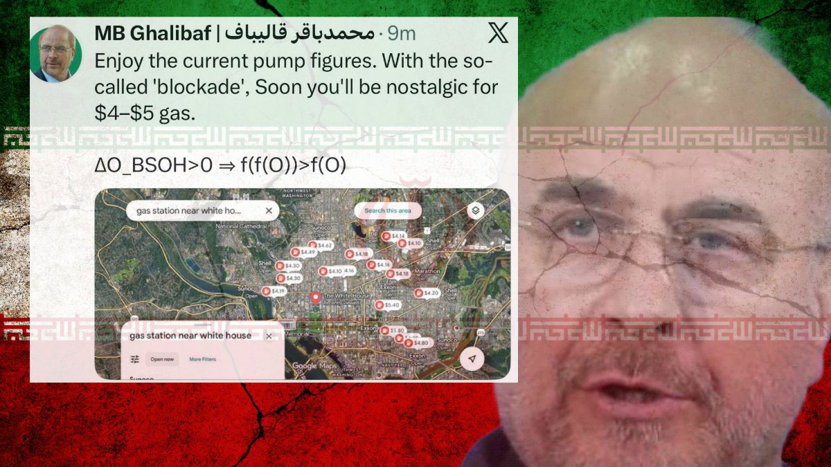 গালিবাফ তাঁর বার্তায় হোয়াইট হাউসের নিকটবর্তী একটি পেট্রলপাম্পের বর্তমান দামের ছবি শেয়ার করে মার্কিন নাগরিকদের উদ্দেশে বলেছেন, ‘এখনকার তেলের দাম দেখে আনন্দ করে নিন। অবরোধ কার্যকর হলে তেলের দাম খুব দ্রুত ৪ থেকে ৫ ডলার ছাড়িয়ে যাবে এবং তখন মার্কিনরা বর্তমানের এই সস্তা দামের জন্য হাহাকার করবে।’