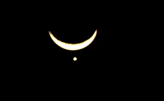 পাতলা এক চিলতে চাঁদ যেন আরও বেশি লালচে দেখাচ্ছে। মাত্র ৬% আলোকিত। চাঁদের ঠিক সামান্য নিচেই ছিল রুপালি-সোনালি রঙের শুক্র গ্রহ।