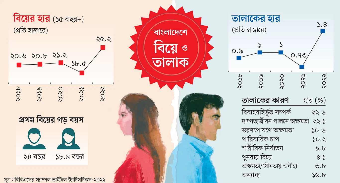 দেশে বিয়ের হার বেড়েছে। বেড়েছে তালাক বা বিবাহবিচ্ছেদও। আর বিবাহবিচ্ছেদের সবচেয়ে বড় কারণ বিবাহবহির্ভূত সম্পর্ক এবং দাম্পত্যজীবন পালনে অক্ষমতা (বনিবনার অভাব)।
